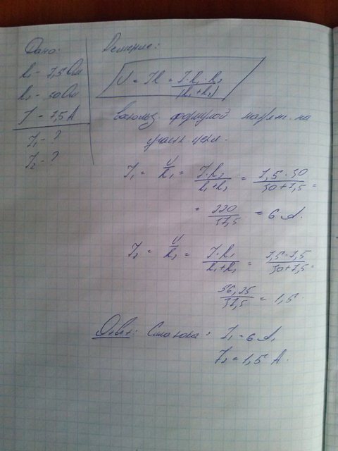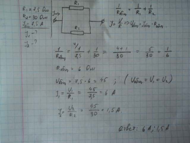 Два резистора, имеющие сопротивления 7,5 и 30 Ом, соединены параллельно. Найдите силу тока в каждом из них, если в подводящих проводах сила тока равна 7,5 А.