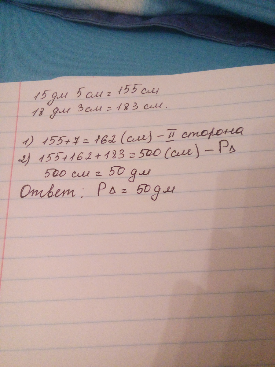 Перша сторона трыкутныка доривнюэ 15 дм 5 см , друга на 7 см довша , ниж перша , а третя 18 дм 3 см. Обчисли периметр трикутника