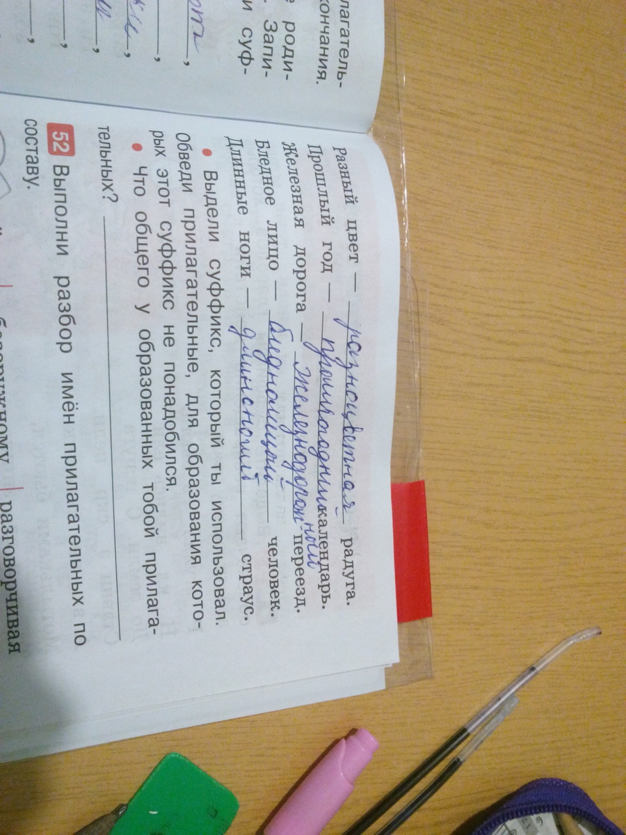 у всех образованеых прилагательных по два корня(разн+цвет; прошл+год; желез+дорог;бледн+лиц;длин+ног) . Также все прилагательные образованы от словосочетания(суш+прил)