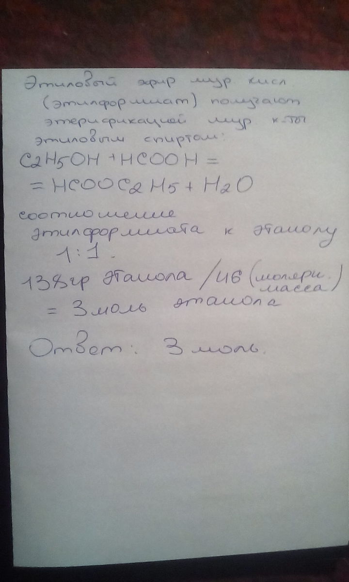 Количество вещества этилового эфира муравьиной кислоты полученного из 138 г этанола, равно: а) 1 моль; б) 2 моль; в) 3 моль; г) 4 моль Выбранный ответ подтвердите решением задачи