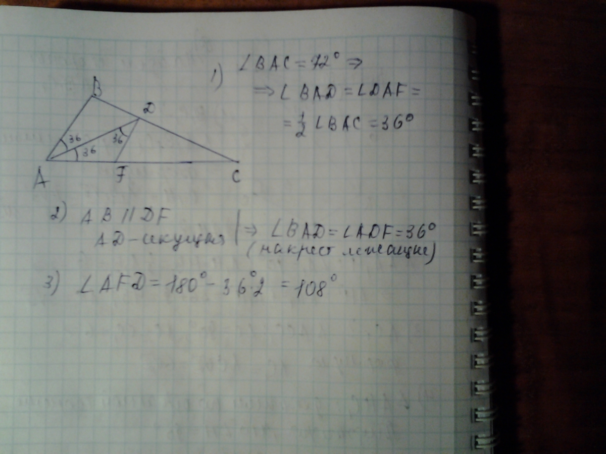 Отрезок AD-биссектриса треугольника ABC.Через точку D проведена прямая,параллельная стороне AB и пересекающая сторону AC в точке F.Найти углы треугольника ADF, если угол BAC=72 градусов
