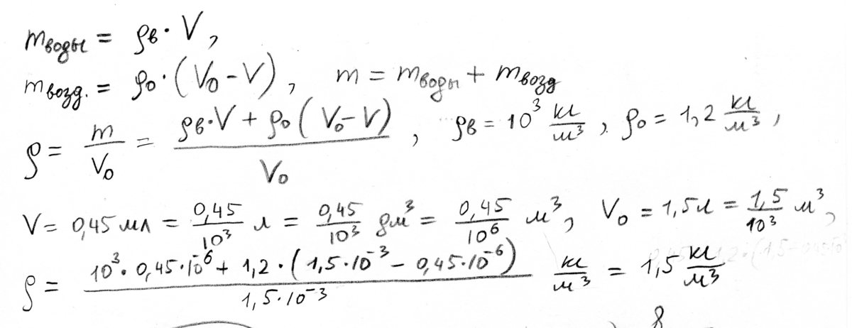 После того, как школьник выпил всю воду из бутылки, в ней осталось V=0,45 мл воды в виде капель на стенках. Он плотно закрыл бутылку и поставил её около окна. Под действием солнечных лучей вся вода внутри бутылки испарилась. Определите плотность получившейся смеси, если первоначальная плотность воздуха составляет ρ0=1,2 кг/м3, а плотность воды — ρв=1000 кг/м3. Ответ выразите в кг/м3, округлив до десятых. Вместимость бутылки равна V0=1,5 л.