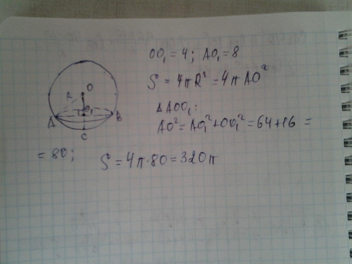 Шар пересечен плоскостью на расстоянии 4 см от центра. Радиус сечения равен 8. Найдите поверхность шара