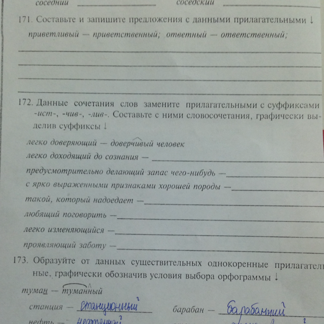 Легко доходящий до сознания - доходчивое объяснение (суффикс -чив-); предусмотрительно делающий запас чего-нибудь - запасливый зверь (суффикс -лив- ); с ярко выраженными признаками какой-нибудь породы - породистая кошка (суффикс -ист-); такой, который надоедает - надоедливый собеседник (суффикс -лив-); любящий поговорить - говорливый друг (суффикс -лив-); легко изменяющийся - изменчивая погода (суффикс -чив-); проявляющий заботу - заботливый дядюшка (суффикс -лив-).