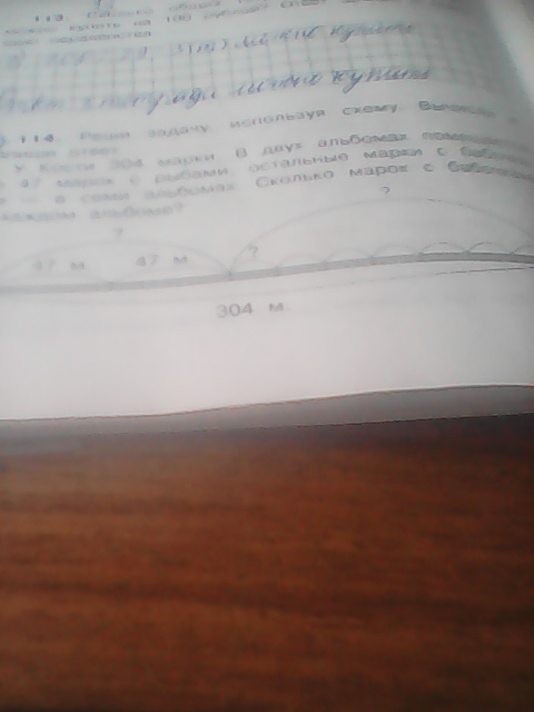 У кости 304 марки.В двух альбомах помещается по 47 марок с рыбами, остальные марки с бабочками-в семи альбомах. Сколько марок с бабочками в каждом альбоме. Помогите пожалуйста!!!