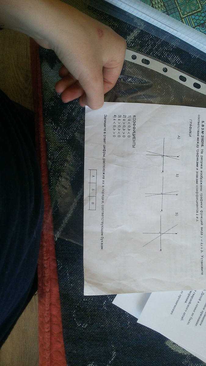 а) и б) проходят через начало к-т, в=0;а) k>0, b=0, б) k<0, b=0, B) k<0, b>0, это №4