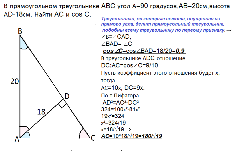 В прямоугольном треугольнике ABC угол А=90 градусов,AB=20см,высота АD-18см. Найти AC и cos C.