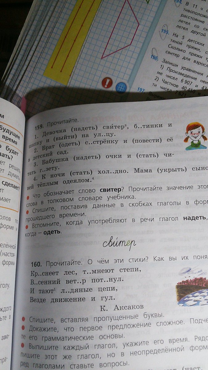 1. Девочка надала свитер, ботинки и выйшла на улицу.