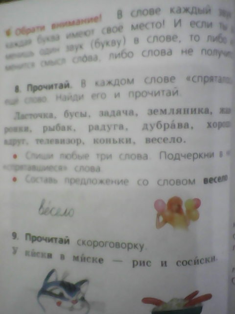 Прочитай. В каком слове спрятались еще слово. Найди и прочитай