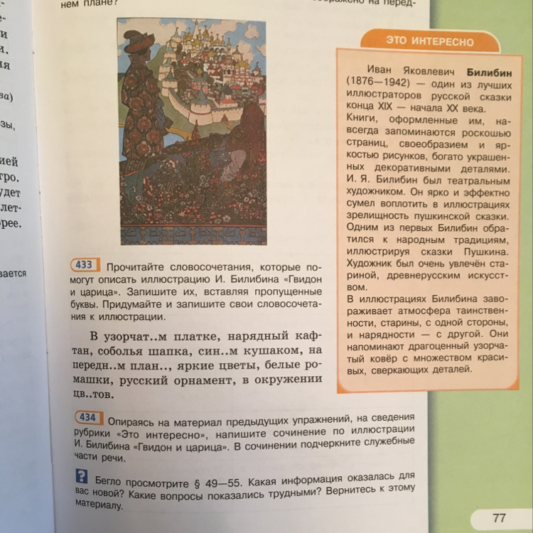 В узорчатом платке , синим кушаком , на переднем плане , в окружении цветов .