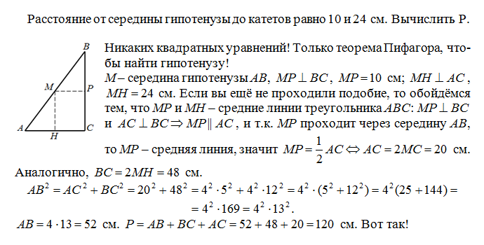 Расстояние от середины гипотенузы до катетов равно 10 и 24 см. Вычислить Р.(теорема Пифагора и вроде квадратное уравнение)Пожалуйста!