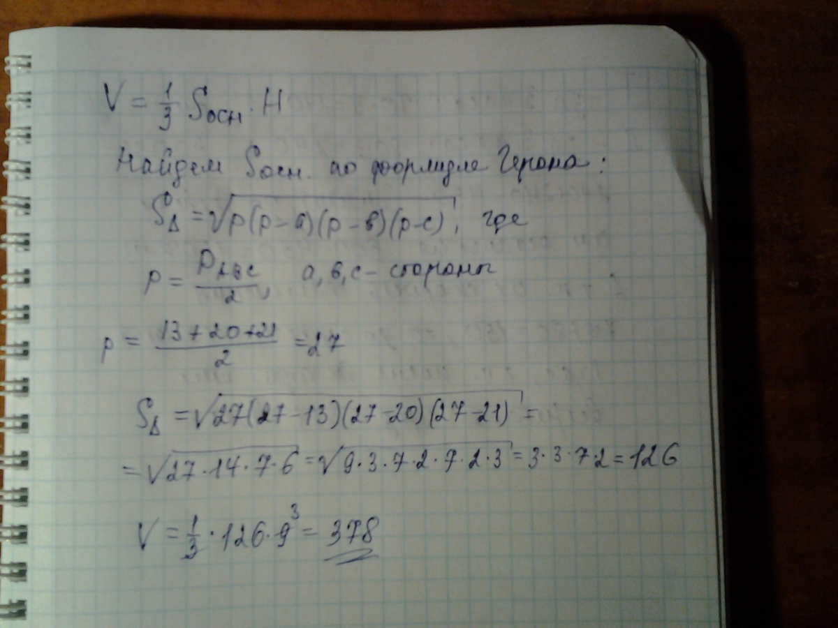 в основі піраміди лежить трикутник зі сторонами 13см, 20 см і 21см. Знайти об'єм призми, якщо іі висота дорівнює 9см