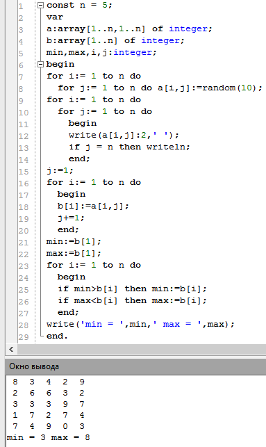 дана матрица А размером 5x5 , все элементы которой различны . получить последовательность элементов главной диагонали a11,a22,...,a55 и указать на максимальное и минимальное значение . все первоначальные элементы массива вводятся с клавиатуры. ПАСКАЛЬ