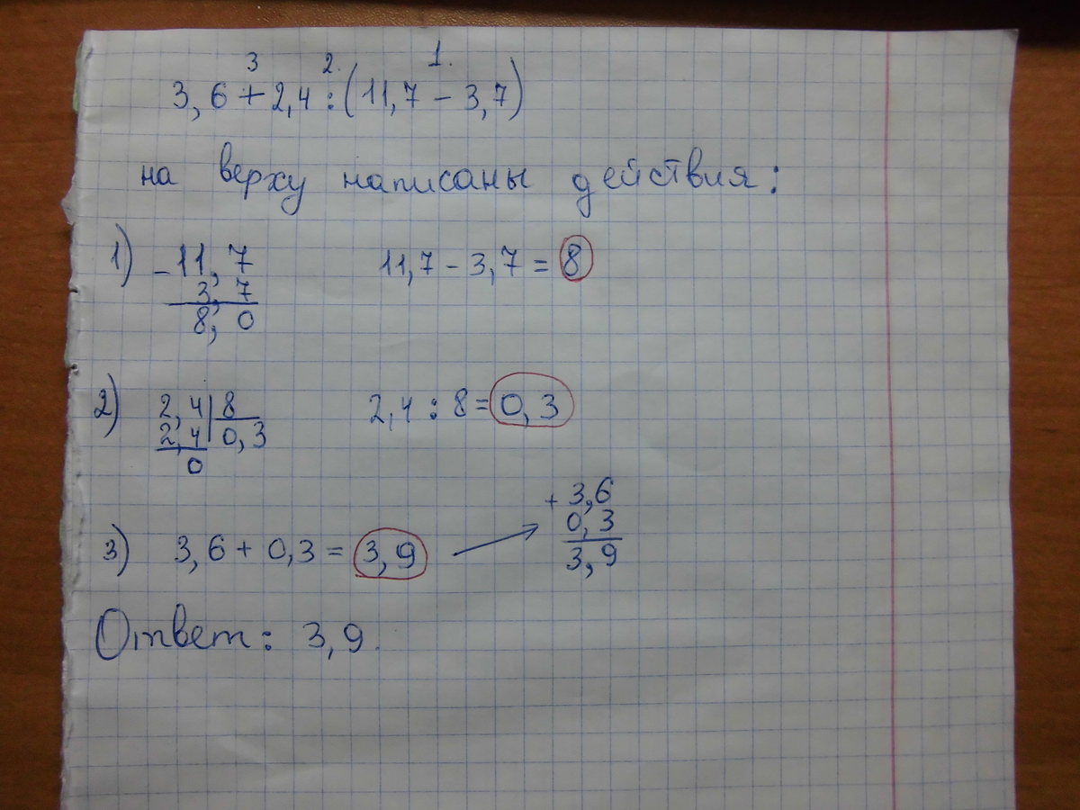 3,6+2,4/(11,7-3,7)=3,6+2,4/8=3,6+0,3=3,9