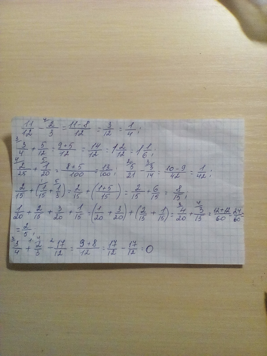 Помогите пожалуйсто, решить примеры с дробями. Вычислите: 11/12-2/3; 3/4+5/12;2/25+1/20; 5/21-3/14. Вычислите: 2/15+(1/15+1/3); 1/20+2/15+3/20+1/15 ; 3/4+2/3-17/12.