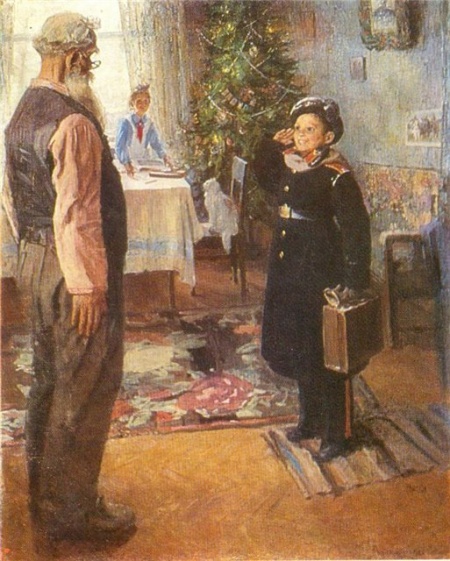 Главный герой отдает честь дедушке, который стоит по струнке смирно. Дедушка наряжен в серые брюки, розоватую рубашку и темно-серый жилет. Он наверняка гордится свои внуком. На дедушку и брата смотрит младшая сестренка. Девочка стоит в голубом платье с белым фартуком и красным галстуком. Картина очень светлая, радостная и по-новогоднему атмосферная.
