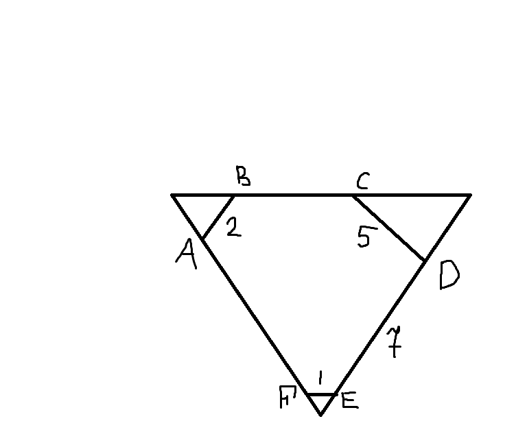 Исходный шестиугольник можно достроить до треугольника. Так как сумма всех углов шестиугольника равна 720 град и все углы равны, то каждый угол равен 120 град. Соответственно, смежные с ними углы равны 60 град. Получаем, что построенный треугольник равносторонний. Приравняв его стороны легко найти неизвестные отрезки AF и BC.