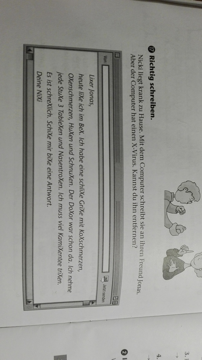 heute liege ich im Bett. Ich habe eine schlimme Grippe mit Kopfschmerzen, Ohrenschmerzen, Husten und Schnupfen. Der Doktor war schon da. Ich nehme jede Stunde 3 Tabletten und Nasentropfen. Ich muss viel Kamillentee trinken. Es ist schrecklich. Schicke mir bitte eine Antwort.