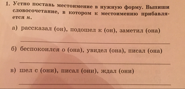 Устно поставь местоимение в нужную форму. Выпиши словосочетания, в котором к местоимению прибавляется "н"