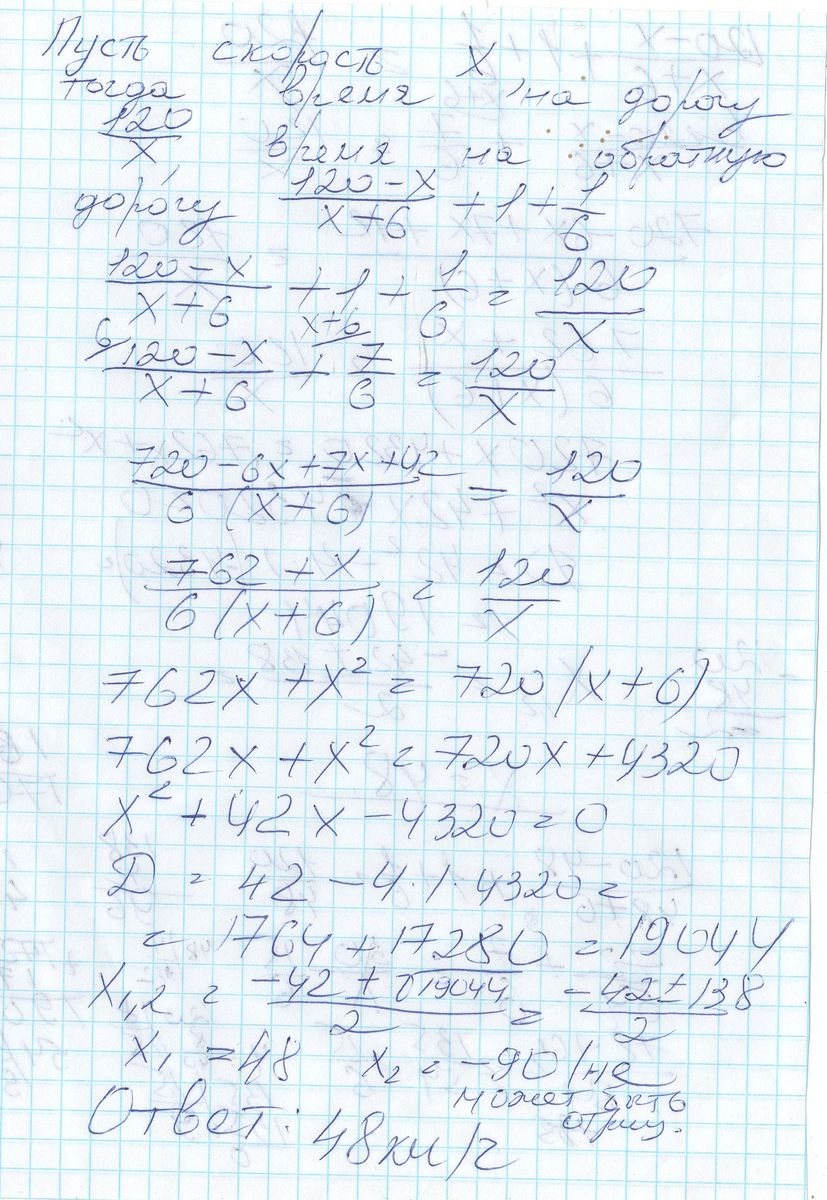 Помогите, пожалуйста Мотоциклист отправился из пункта А в пункт В, отстоящий от А на 120 км. Обратно он выехал с той же скоростью, но через час после выезда должен был остановиться на 10 мин. После этой остановки он продолжал путь до А, увеличив скорость на 6 км/ч. Какова была первоначальная скорость мотоциклиста, если известно, что на обратный путь он затратил столько же времени, сколько на путь от А до В?
