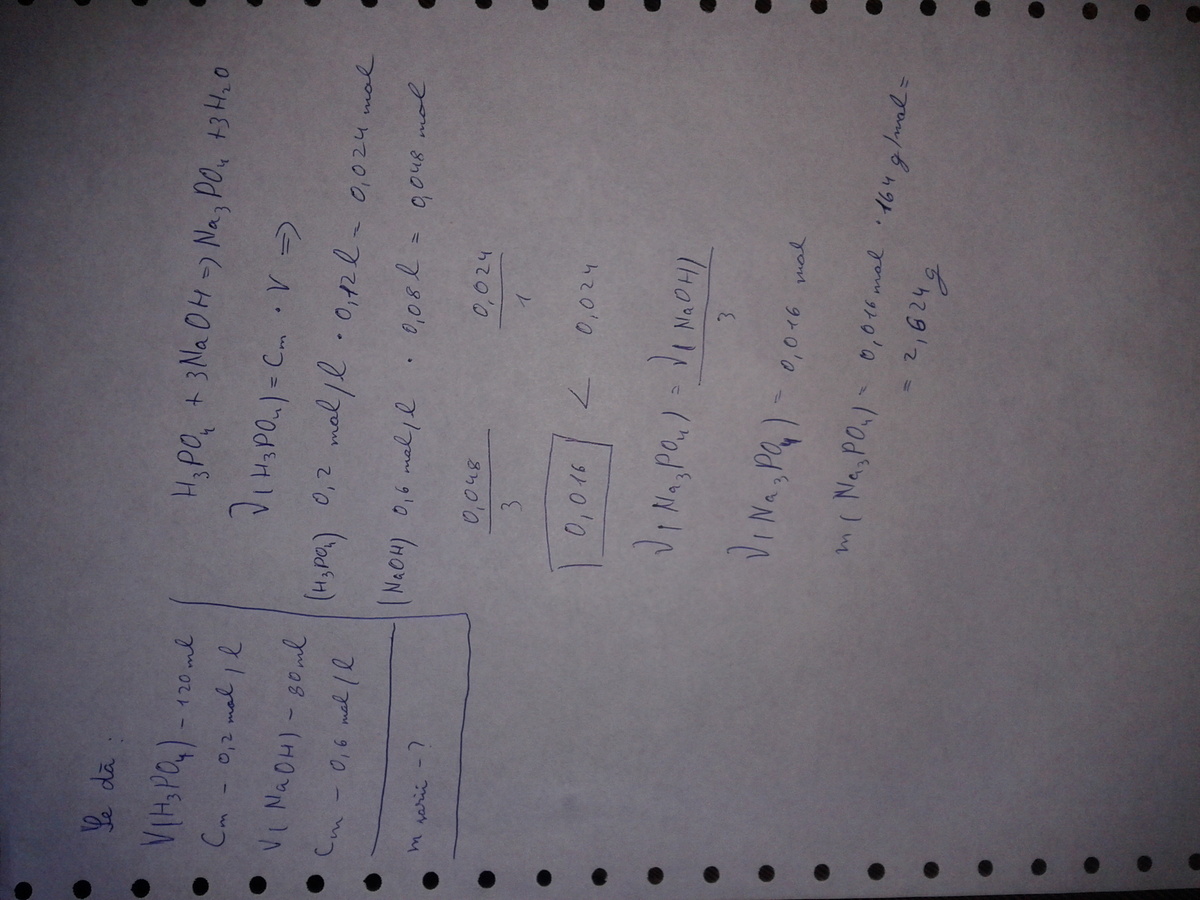 вычислите массу соли образующейся при смешивании раствора ортофосфатной кислоты объемом 120 мл с концентрацией кислоты 0.2 моль / л раствора натрия гидроксида объемом 80 мл с концентрацией щелочи 0.6 моль/л