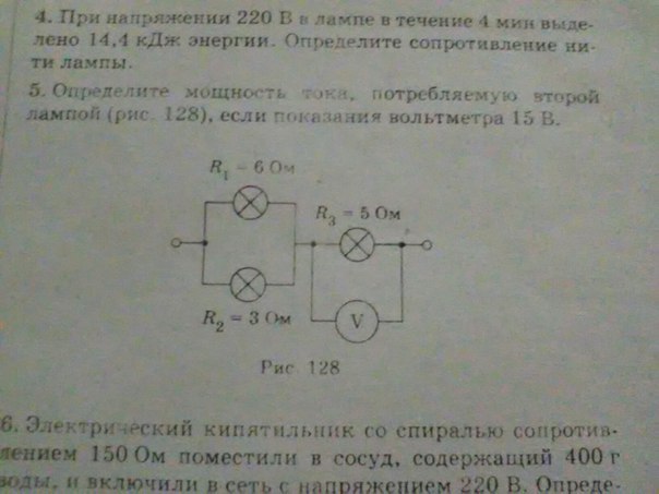 Помогите!!!!Определите мощность тока,потребляемую второй лампой(рис.128),если показания вольтметра 15В