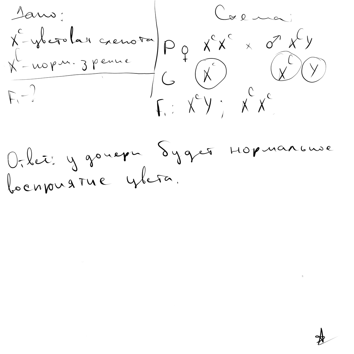 У человека цветовая слепота обусловлена цветным геном (с), а нормальное зрение его доминантное аллели (С). Ген цветной слепоты локализован в Х-хромосоме. А) Женщина, страдающая цветовой слепотой, вышла замуж за мужчиной с нормальным зрением. Каким будет восприятие цвета в дочерей от этого брака?