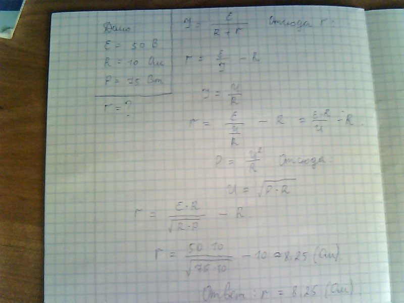 ДАно: R=10 Ом, P= 75, E=50 В.Найти r -?