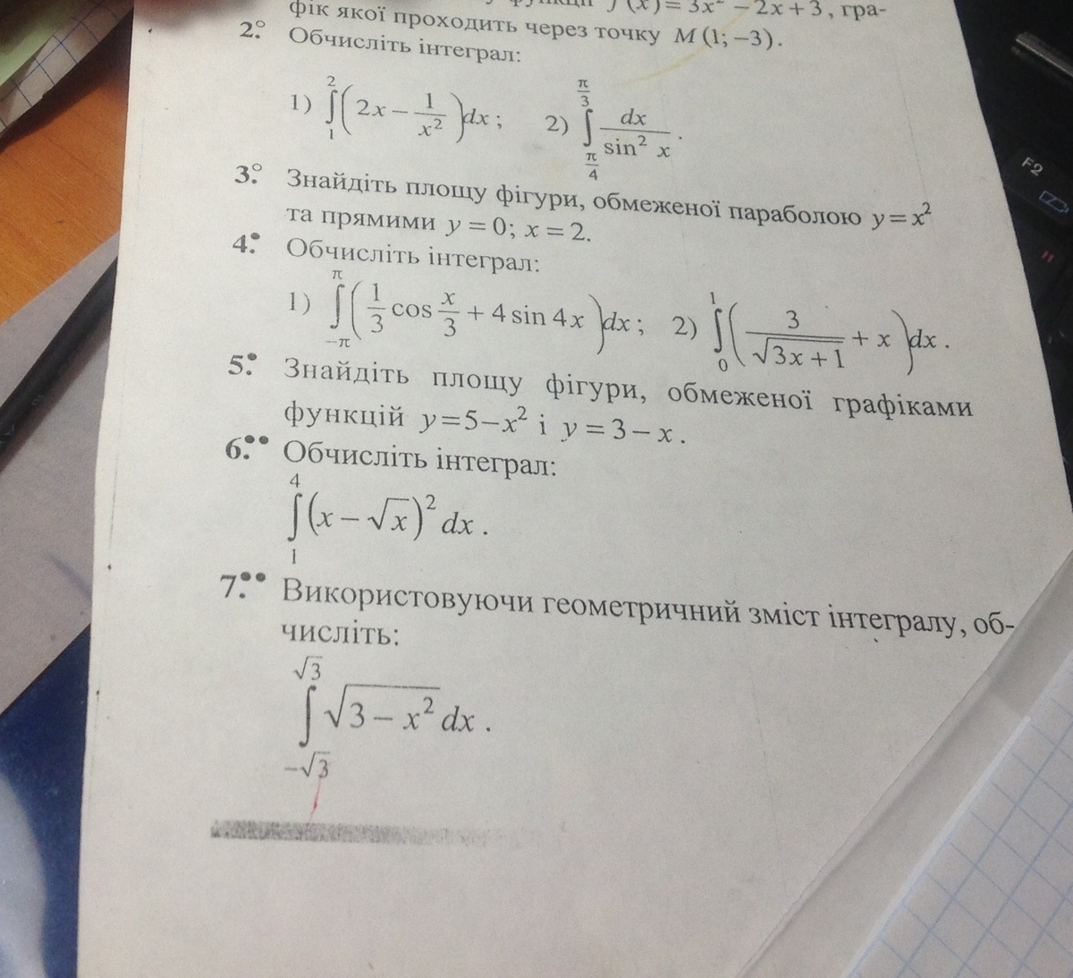 4) ∫ !/3сos(x/2) dx +4sin4x dx=(1/3 *2sin(x/2) +4* 1/4 *(-cos4x)) |от -π до π=2/3 sinπ/2 -cos(4*π) -2/3sin(-π/2) -(-cos(-4π)=2/3-1+2/3+1=4/3;