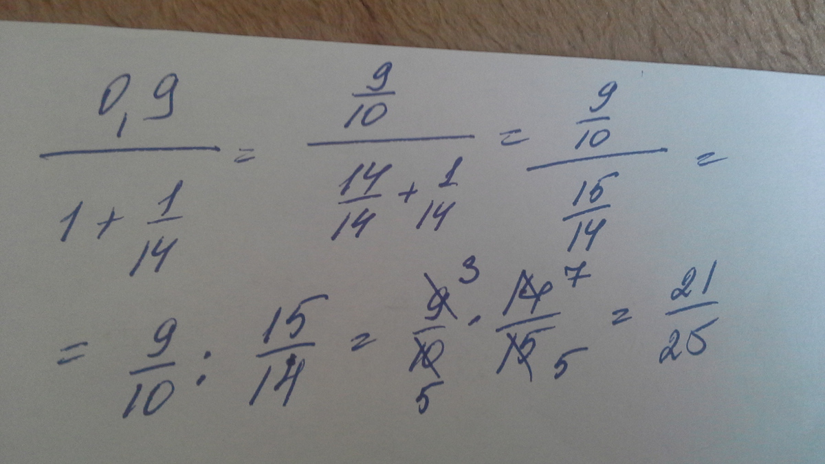 в знаменателе к общей дроби, получишь 15/14, потом переворачивай дробь эту, получишь 0,9 умножить на 14/15 сокращай на 0,3 получается 3 умножить на 14/5, в итоге 42/5=8,4