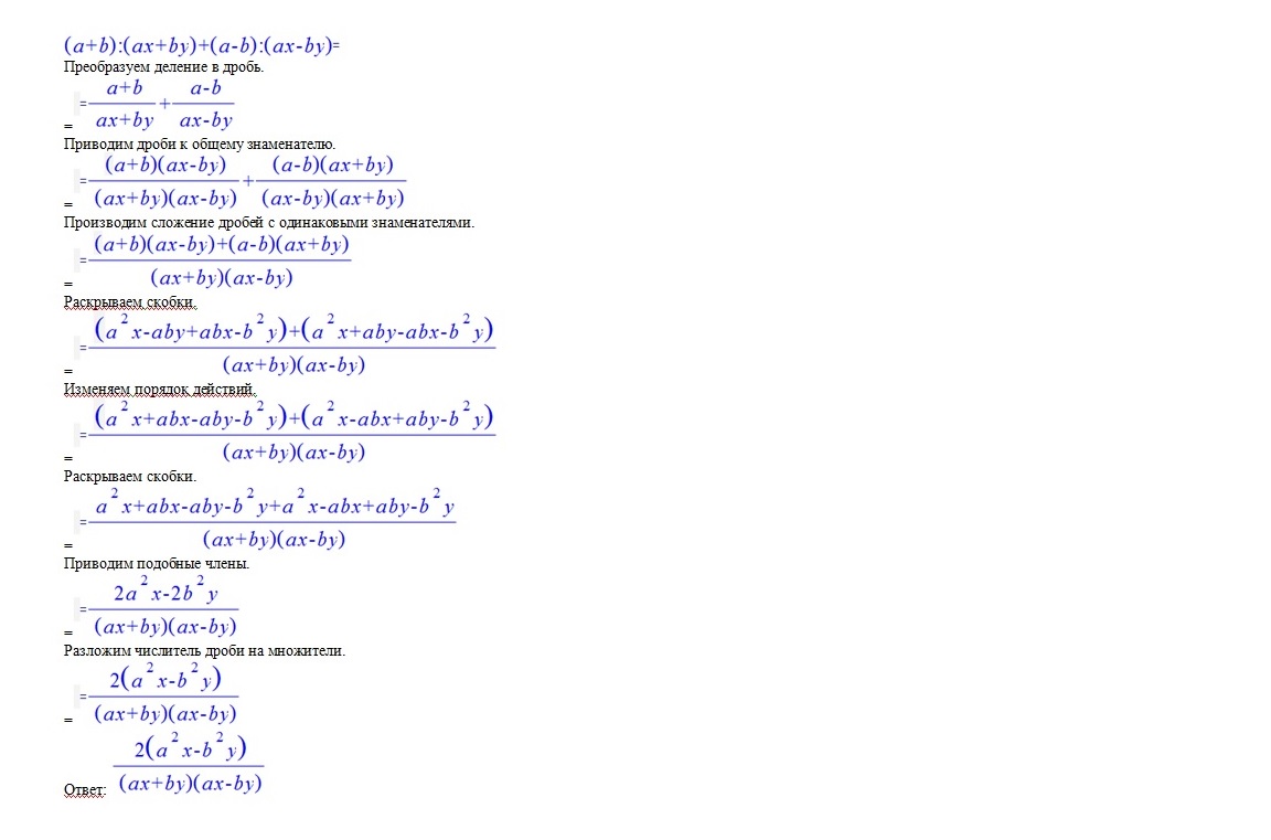 (a+b)/(ax + by)+(a-b)/(ax - by)={(a+b)*(ax - by)+(a-b)*(ax + by)}/(ax-by)(ax+by)=