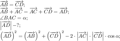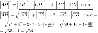 длина вектора ab равна 7 длина вектора ac равна 5 косинус угла между этими векторами равен -1\56 найдите длину вектора ab+ac