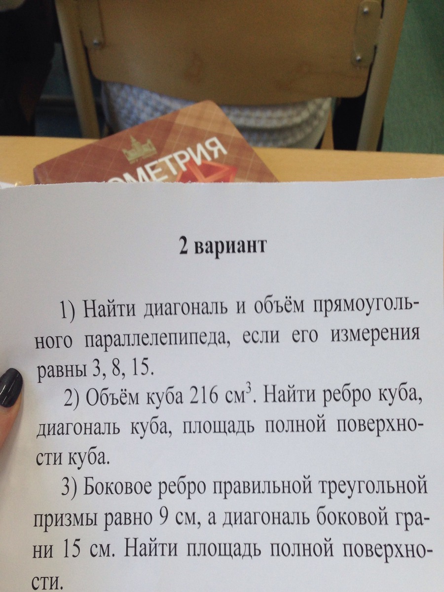 чтоб найти объем просто 3×8×15=360 ,а диагональ √8^2+3^=√64+9=8+3=11