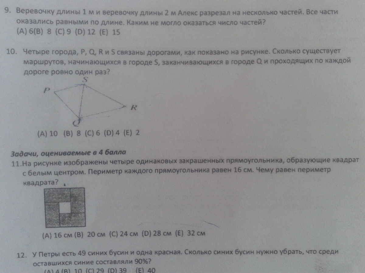 В 11 задании ответ (Е) 32 см. Если периметр прямоугольника 16, то сумма длин его смежных сторон равна 8 см (половине от периметра). Мы видим, что каждая сторона квадрата состоит из большой стороны прямоугольника и его маленькой стороны. Значит, сторона квадрата равна 8 см. У квадрата 4 стороны, все они равны. 8*4=32. Того 32 см)