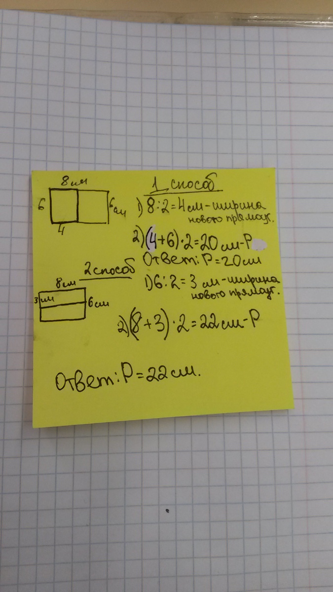 Прямоугольник со стороной 8 см и 6 см разрезали на 2 равных прямоугольника и составили из них новые прямоугольник,отличный от заданного.найди его периметр.рассмотри 2 случая.