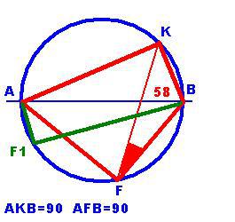 На окружности по две разные стороны от диаметра AB взяты точки К и F. Известно, что угол KBA=58 градусам. Найдите угол KFB. Ответ дайте в градусах
