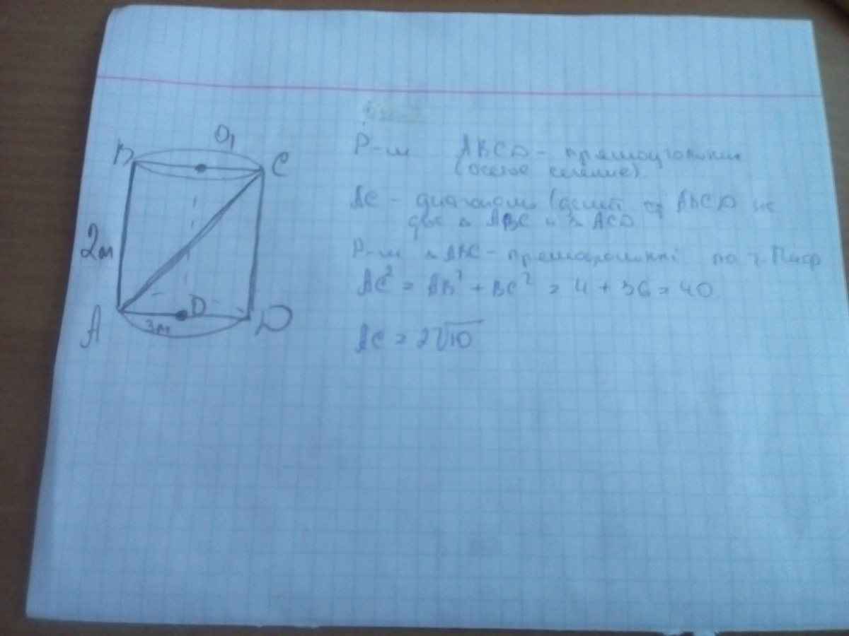 осевое сечение цилиндра-прямоугольник. так как радиус 3м то диаметр (одна сторона прямоугольника)-6 м. Высоа цилиндра 2 (вторая сторона прямоугольника) Диаоганаль делит прямоугольник на два прямоугольных треугольника (является гипотенузой). по теореме Пифагора находим c^2 = a^2 + b^2