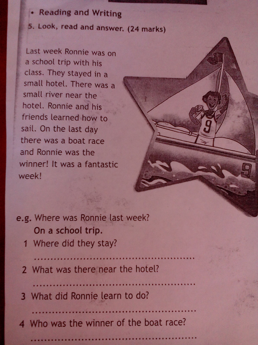 1 in a hotel 2 a river 3 to sail 4 Ronnie