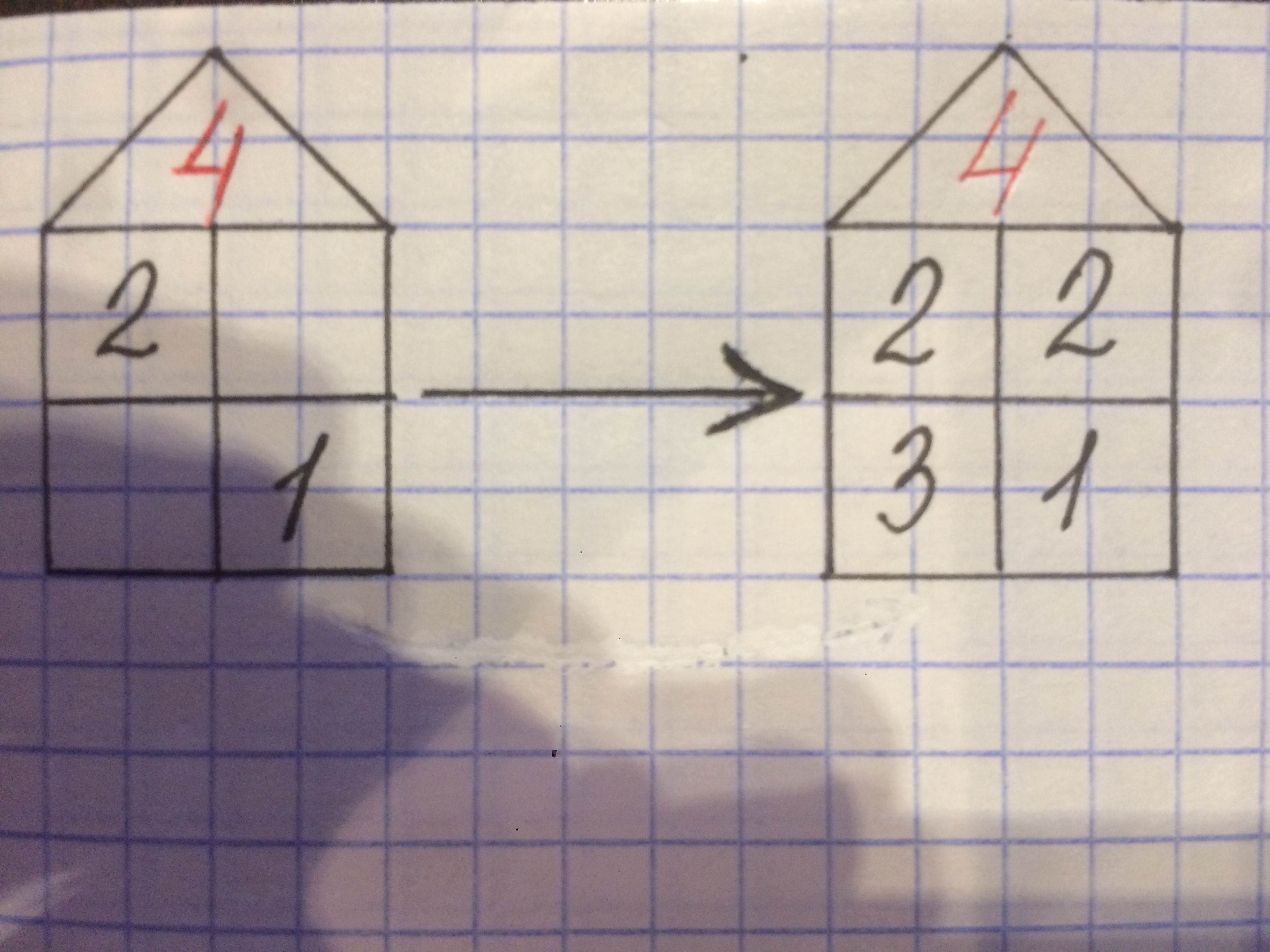 "засели числа в домик ". (питерсон- самостоятельна работа)(задание в виде домик ,на крыше чмло 4 ,а ниже на первой строчке число 2 следущая клетка пустая ,а ниже под чилом 2 клетка пустая .а следущая число 1 Надо заселить числа в пустые клетки