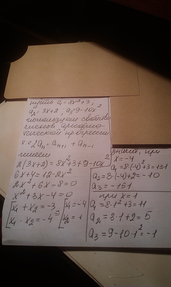 Найдите все значения х,при которых значениях выражений 8х²+3;3х+2;9-10х² является тремя последовательными членами арифметической прогрессии.