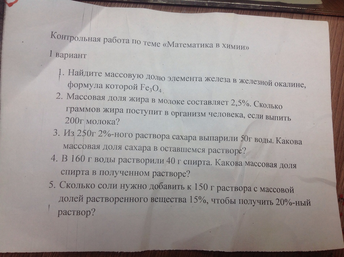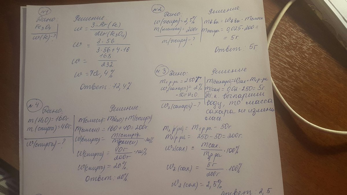 1. Дано: Fe3O4. Найти: w(Fe). Решение: общая формула массовой доли выглядит так: w=n*Ar/Mr*100%, где n - количество атомов элемента, Ar - относительная атомная масса элемента, Mr - относительная молекулярная масса вещества. Подставляем: w(Fe)=56*3/(56*3+16*4)*100%≈72%. Ответ: 72%.
