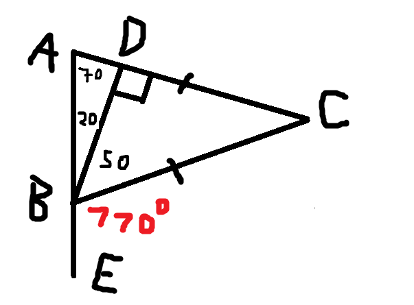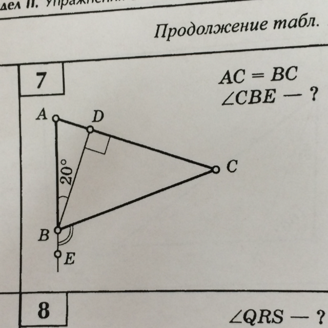 Т,к. AC=BC, то треугольник ABC -равнобедренный, значит <CAB=<ABC. Т.к. сумма градусных мер углов любого треугольника равна 180 градусам, то <BAC=180-90-20=70 градусов, а значит <ABC тоже равен 70 градусам. Т.к. <ABE - развернутый, то он равен 180 градусов, а значит <CBE=180-70=110 градусов.