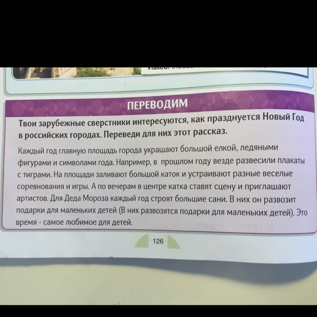 Your foreign peers are interested in how to celebrate the New Year in their cities. Translate to them this story. Every year, the town square is decorated with a large Christmas tree, ice figures symbols of the year. Harrimer, last year put up posters everywhere with the Tigers. On the square is filled a large skating rink and organize various fun competitions and games evenings the center of the rink and put the scene prilashayut artists. For Santa Claus every year they build large sani.V he delivers gifts to small children were conveyed Brih gifts for small children) .This time-favorite for children.