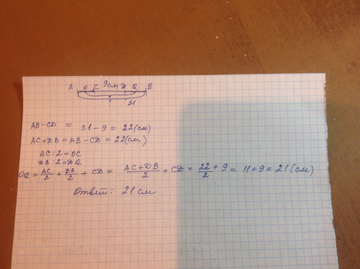 Отрезок равный 31 см разделен на три неравных отрезка. Длина среднего отрезка равна 9 см. Найдите расстояние между серединами крайних отрезков.