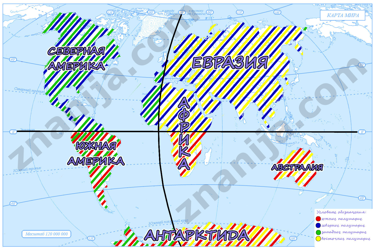 подпиши материки и укажите штриховкой разного цвета их части, расположенные в соответствующих полушариях земли(Северном,Южном,Западном и восточном).Внесите соответствующие условные знаки в легенду карты