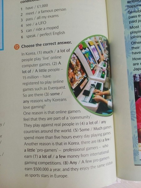 1) much 2) A lot of 3) any 4) a lot of 5) some 6) a few 7) a lot of. Вот небольшая подсказка: "Some" - используется в обычных предложениях, где нет вопроса либо отрицания, а "any" используется в отрицательных либо вопросительных предложениях. "A few" - переводится как несколько.