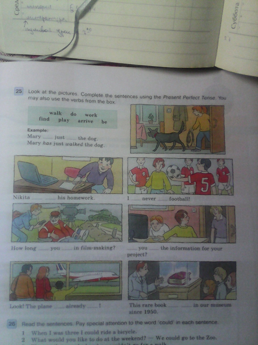 Look at the pictures . Complete the sentences using the Present Perfect Tense . You may also use the verbs from the box.