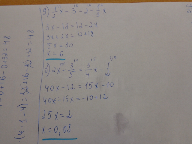 з) 2x - 3/5 = 3/4x - 1/2 ⇒ 2x-3/4x = 3/5-1/2 ⇒1.1/4x=6/10-5/10⇒5/4x=1/10 ⇒ x=1/10:5/4 ⇒x=1/10*4/5⇒ x=2/25