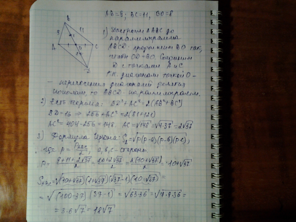 Применены: теорема о диагоналях параллелограмма, формула Герона