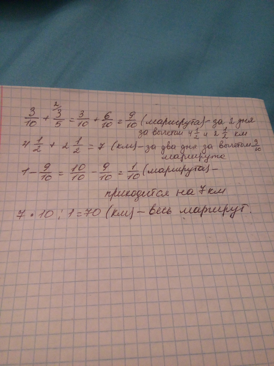 Помогите решить задачу: Туристы прошли свой маршрут за два дня. В первый день они прошли 3/10( три десятых) маршрута и ещё 4 1/2( четыре целых одна вторая) км, во второй день- 3/5(три пятых) маршрута и оставшиеся 2 1/2( две целых одна вторая) км. Чему равна длина маршрута?